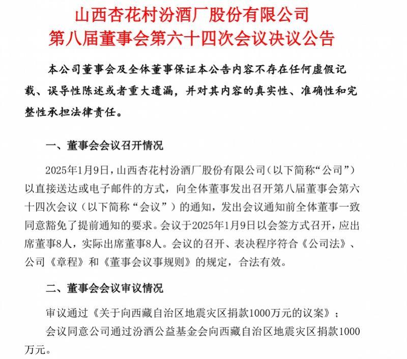 1月9日,山西汾酒发布第八届董事会第六十四次会议决策公告,公告瓦解,公司于当日审议通过《对于向西藏自治区地震灾地捐钱1000万元的议案》,会议高兴公司通过汾酒公益基金会向西藏自治区地震灾地捐钱1000万元。